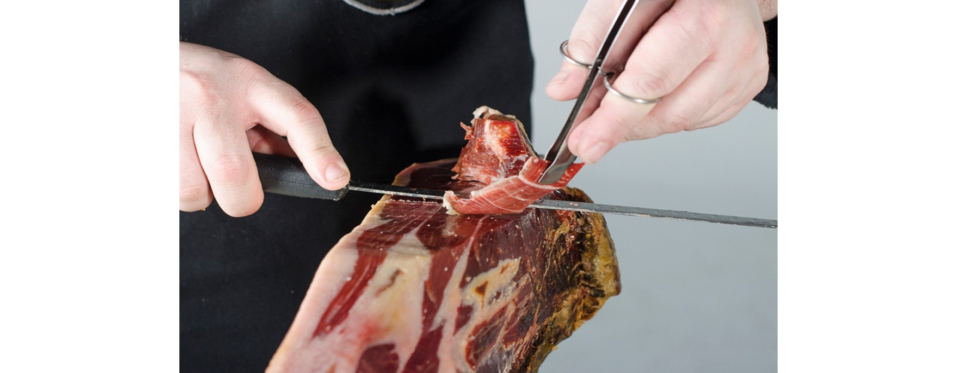 Por lo que respecta a las lonchas de carne, procura que no sean ni muy finas ni muy gruesas. Si logras que el cuchillo se insinúe por debajo de la carne, lograrás que el propio aceite de esta se derrita en tu paladar potenciando el sabor de la paletilla. La dirección correcta del corte será hacia nosotros.
