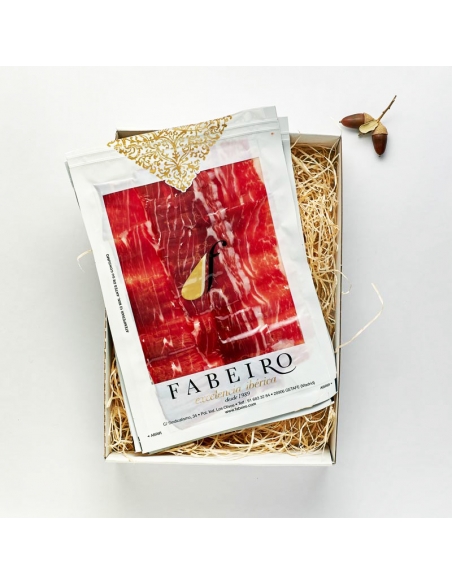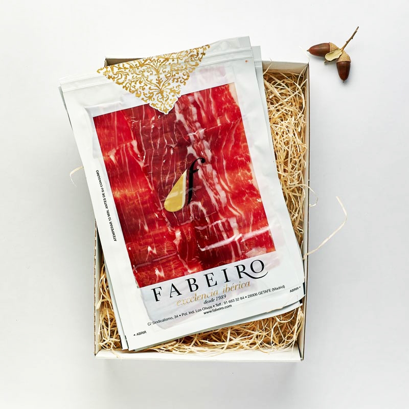 La caja de loncheados de jamón ibérico se presenta en versiones de cinco, diez o quince sobres. Cada sobre contiene 100 gramos de lonchas cortadas a cuchillo y envasadas al vacío que garantizan la conservación de todas las cualidades de la pieza original. Así, a la vista, la carne varía entre el rosa y el rojo púrpura, con un tono brillante al corte donde se aprecian las vetas de tejido adiposo y con grasa infiltrada en la masa muscular.